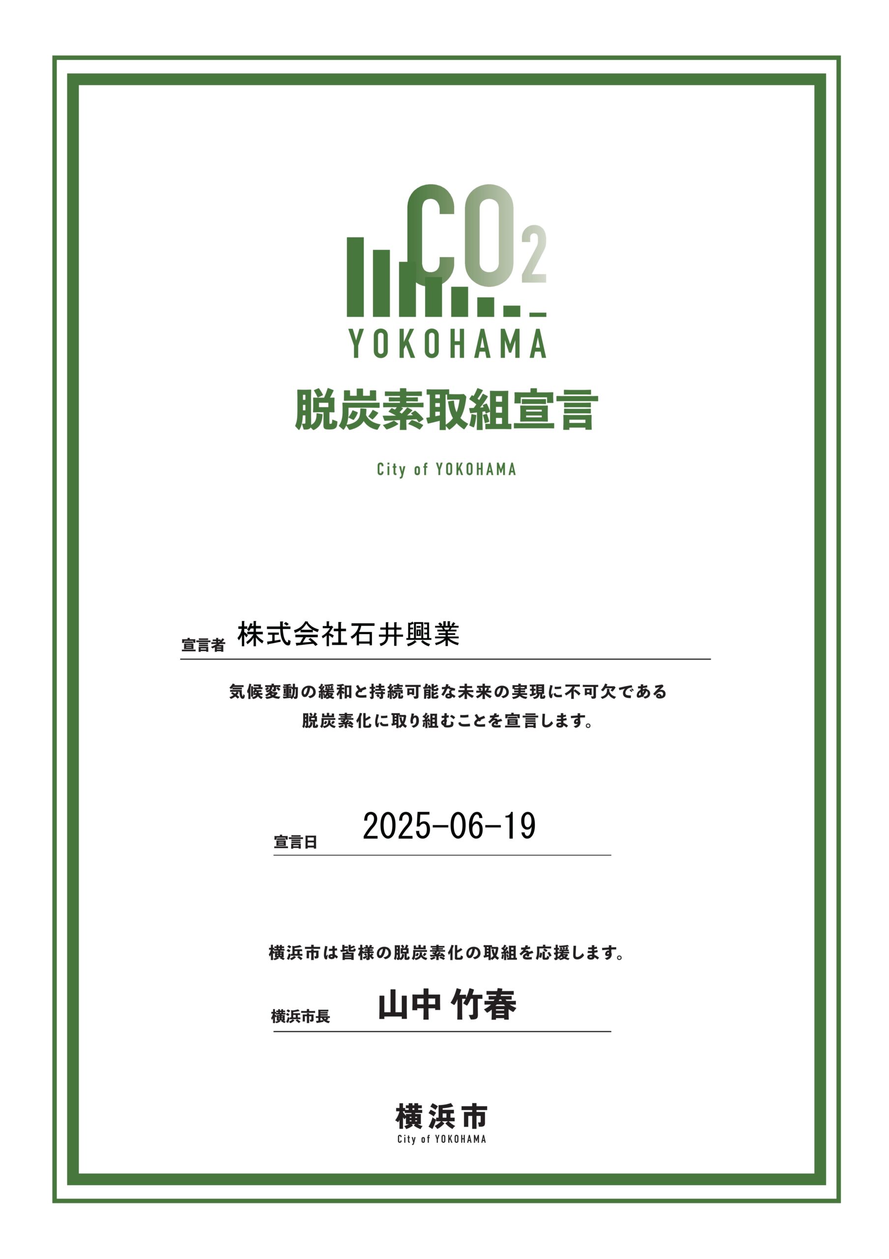 株式会社石井興業は横浜市が推進している「脱炭素宣言」に賛同し、日々の業務の中で環境にやさしい取り組みを進めています。運送業は多くの車両を使う仕事だからこそ、燃料の効率化や省エネ運転、車両の適切な整備など、小さな工夫の積み重ねが大切だと考えています。また、CO₂排出の少ない車両の導入や配送ルートの最適化にも努め、環境への負担を減らしながら、安心・安全な輸送サービスを提供しています。こうした取り組みを続けることが、次の世代へきれいな環境を残すことにつながると信じています。「環境にやさしい運送会社」であるために、株式会社石井興業はこれからも横浜市と共に脱炭素社会の実現を目指し、持続可能なまちづくりに貢献してまいります。